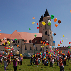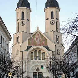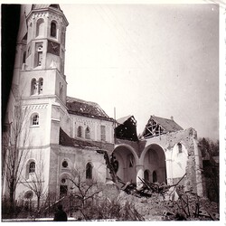 Außen an der Vorderfront der Kirche wurde 1955 ein Sgraffito angebracht. Es zeigt die heilige Familie, allerdings Christus als den Auferstandenen. Am rechten Glockenturm hängen zwei Stahlglocken aus der Zeit vor dem 1. Weltkrieg - die 1935 geweihten Glocken wurden im Krieg bis auf die kleine Wandlungsglocke eingeschmolzen. Das alte Mauergewölbe der Kirche wurde nicht mehr ausgestaltet, stattdessen schuf man 1953 die heutige Holzdecke.